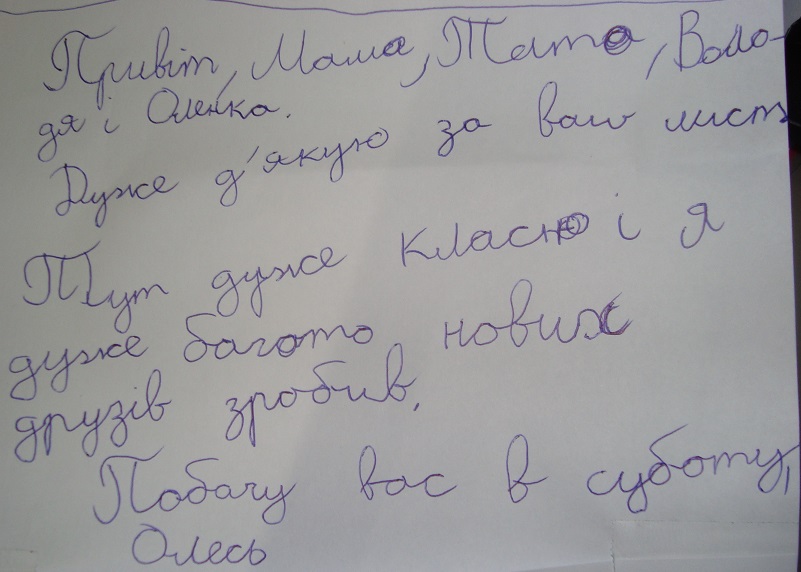 Beste papa en mama. Het gaat heel goed met mij en Jonas. Geen ruzie, wel samen badmintonnen. Doe de groeten aan DC en Banjer. (PS zeg maar tegen Tygo dat ik maandag niet kom slapen.)